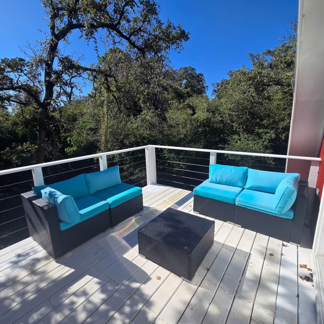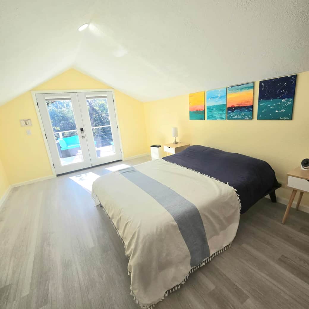 The airy loft bedroom offers a comfortable queen bed and opens up to a large private balcony — perfect for morning coffee, yoga, or late-night stargazing under Somerville’s wide-open sky.